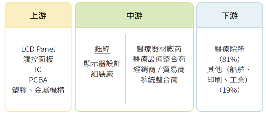 鈺緯科技著重於醫療用、工業用及專業色彩應用顯示器的研究發展與生產製造,在醫療器材產業鏈屬於專業顯示器製造商,採購來自於上游的顯示面板、觸控面板、電子元件等關鍵原物料,以及其他相關零組件,透過生產設備加工製造高品質的醫療顯示器後,出貨給下游醫療設備廠商。2024 年本公司供應鏈及與上下游廠商和客戶間的商業關係無重大顯著改變。